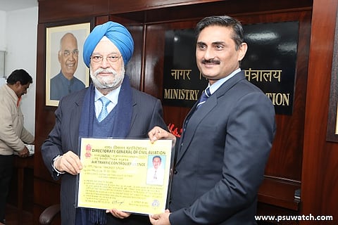 New Delhi: Minister of State for Civil Aviation Hardeep Singh Puri handed over the first-ever licence to air traffic controllers of AAI (Airports Authority of India) on Monday, at a ceremony held in Ministry of Civil Aviation, at Rajiv Gandhi Bhawan, New Delhi. Ministry of Civil Aviation's Secretary Pradeep Singh Kharola, Ministry of Civil Aviation's Director-General Arun Kumar, AAI's Member (HR) Anuj Aggarwal, AAI's Member (ANS) Vineet Gulati and other senior officers of Ministry of Civil Aviation, DGCA and AAI were also present at the event.