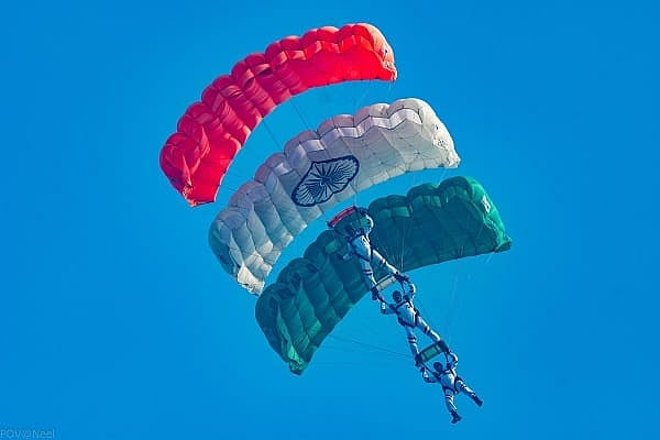 A member of the Akashganga Skydiving team displaying skill and valour