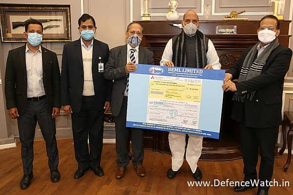 New Delhi: Bharat Earth Movers Limited (BEML), a Miniratna defence PSU under the Ministry of Defence, has paid a dividend of Rs 5.625 crore to Defence Minister Rajnath Singh in New Delhi on Monday. The dividend cheque was handed over by BEML's Chairman and Managing Director (CMD) Dr Deepak Kumar Hota to the minister. On the occasion Secretary (Defence Production) Raj Kumar and other senior officials of Ministry of Defence and BEML were present.