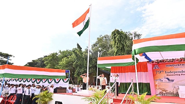 HSL's Chairman & Managing Director (CMD) Cmde Girideep Singh, IN (Retd.), unfurled the national flag and reviewed the parade, which featured Security and Fire Service personnel, NCC cadets, Rover Scouts, Scouts & Guides, and students from HSL and nearby schools.