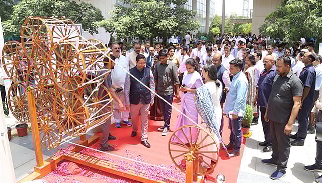 A major highlight of the day was the unveiling of a “Waste to Art” installation – a CHARKHA, constructed entirely from 200 kg of recycled waste materials. The artwork, symbolizing self-reliance and sustainability, was unveiled by CMD along with senior officials.