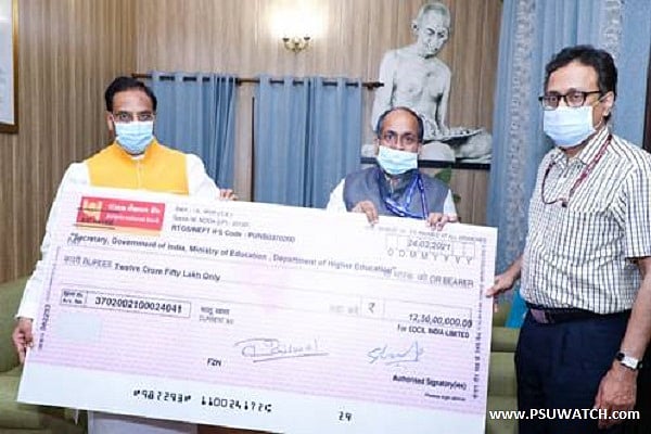 New Delhi: EdCIL (India) Limited has paid the highest-ever dividend of Rs 12.5 crore for the financial year 2019-20 (FY 2019-20) on Tuesday. The dividend cheque has been presented by EdCIL's Chairman & Managing Director (CMD) Manoj Kumar to Union Minister of Education Ramesh Pokhriyal Nishank. Ministry of Education's Additional Secretary (Technical Education) Dr Rakesh Ranjan and other officials of the Ministry and EdCIL were also present on the occasion.