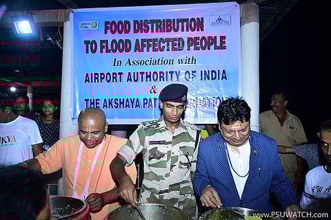 Guwahati: This is what separates profit-driven corporates from public welfare centric business organisations i.e. PSUs. Airports Authority of India's North East regional director joined hands with Akshay Patra Foundation and volunteering for the people affected by the devastating flood in various parts of Assam. Both the organisations carrying out relief operations distributing packed drinking water and ready to serve meals to flood survivors at relief camps.