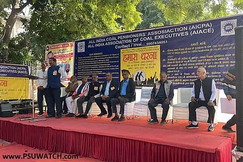 New Delhi: Pensioners from coal PSUs, like Coal India Ltd (CIL), South Eastern Coalfields Ltd (SECL) and other subsidiary companies of CIL, who are receiving a meagre pension of Rs 1,000 every month assembled at Jantar Mantar on Monday for a day-long dharna to protest against the lack of pension revision for the last 24 years. The pensioners, who gathered under the banner of All Indian Coal Pensioners Association (AICPA) & All India Association of Coal Executives (AIACE), demanded a review of CMPS 1998 and revision of pension for coal miners.