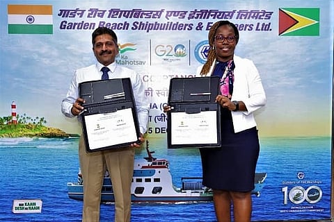 New Delhi: Garden Reach Shipbuilders and Engineers (GRSE) Limited and Transport & Harbours Department (T&HD), Cooperative Republic of Guyana have signed the 'technical acceptance' document of the Ocean-Going Passenger & Cargo Ferry Vessel designed and built by GRSE. The technical acceptance has been signed by GRSE's Chairman & Managing Director (CMD) Cmde PR Hari and Transport and Harbours Department (T&HD), Guyana Yurlander Hughes at Kolkata in the presence of officials from GRSE, Ministry of Public Works, Govt of Guyana and Ministry of External Affairs, Govt of India. The vessel shall now be transported to Guyana for the final delivery.