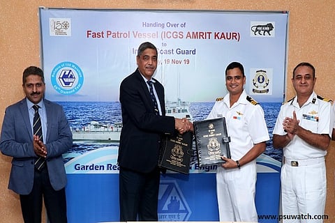 The delivery was done within a time gap of just 14 days from November 5, when GRSE delivered its 101st Warship ICGS Annie Besant, second in the series to the Indian Coast Guard, which is a unique achievement in itself. The Protocol of delivery and acceptance was signed between GRSE's Chairman and Managing Director (CMD) Rear Admiral VK Saxena, IN (Retd.) and commanding officer of the vessel, Commandant (JG) Himanshu Mishra, in the presence of Commandant AVW Rao, CGRPS (Kolkata) and Cmde. PR Hari, Director (Personnel) and other Senior Officials of GRSE and Indian Coast Guard.