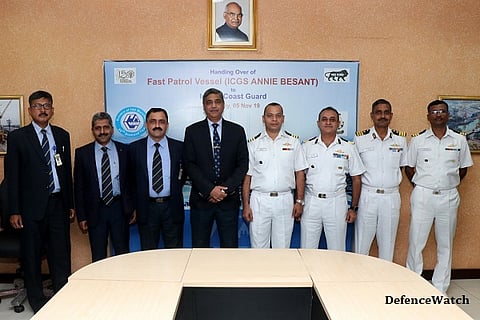 Kolkata: Garden Reach Shipbuilders and Engineers Limited (GRSE), a Miniratna Category-1 warship building PSU under the administrative control of the Ministry of Defence, delivered its 101st ship to the Indian Coast Guard. GRSE ICGS Annie Besant, the second in a series of five Fast Patrol Vessels (FPV) ordered by the Indian Coast Guard, was handed over on Tuesday. The protocol of delivery and acceptance was signed between GRSE's Chairman & Managing Director, Rear Admiral (Retd) VK Saxena, and Commanding Officer of the vessel, Commandant (JG) Sunny Deo, in the presence of DIG Sudhir Sahani, TM, Principal Director (Material), Cmde PR Hari, Director (Personnel) and Cmde Sanjeev Nayyar, IN (Retd), Director (Shipbuilding) and other senior officials of GRSE and the Indian Coast Guard.