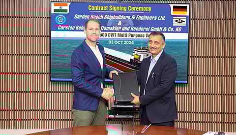New Delhi: The Garden Reach Shipbuilders and Engineers (GRSE) Limited has signed an agreement with Carsten Rehder Schiffsmakler and Reederei GmbH & Co. KG Germany on Thursday, for the construction and delivery of 5th multi-purpose vessel (MPV) of 7,500 DWT. This contract is in line with the ‘Option Agreement’ signed between both the parties, for procurement of four additional MPVs from GRSE. The shipyard will build a total of eight vessels at approx. order value of 108 MUSD.