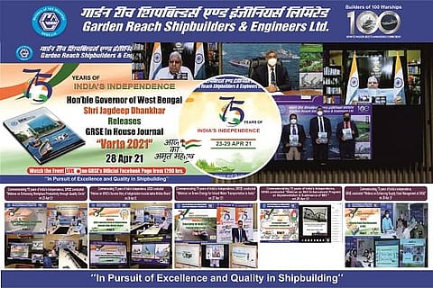 New Delhi/Kolkata: Garden Reach Shipbuilders and Engineers Limited (GRSE) communed celebrations of the country's 75 years of Independence (India@75) – Aazadi ka Amrit Mahotsav through week-long celebrations. The highlight of the commemorations was the e-release of GRSE's annual in-house journal VARTA 2021 by the Governor of West Bengal Jagdeep Dhankhar in presence of GRSE's CMD Rear Admiral VK Saxena IN (Retd.), Director (Shipbuilding) Cmde Sanjeev Nayyar, Director (Personnel) Cmde PR Hari and other senior officials of GRSE on April 28.