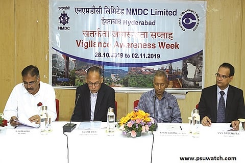 Hyderabad: On the occasion of vigilance week, 'Vigilance Awareness programme' has been inaugurated at NMDC Limited's corporate headquarters in Hyderabad. NMDC's Director (Personnel) Sumit Deb administrated the pledge to the employees in presence of Chief Guest, APVN Sarma, IAS (Retd), advisor to the governor. NMDC's Executive Director (Engg. & Projects) S Surender and other senior officials participated in this event.