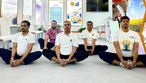 On International Yoga Day 2024, the SECI team, led by Director (Solar) Sanjay Sharma, performed Yoga at their booth. This attracted many curious onlookers from nearby international booths, who cheered, took photos, made videos, and interacted with the SECI team to learn more about Yoga and IYD. It was a fun and enriching experience, allowing the team to share information about India with participants from other countries. Few international participants joined the SECI team, trying out simple yet interesting Yoga poses, which led to much amusement and enjoyment. Through this effort, the SECI team aimed to globalize Yoga and share India's rich cultural heritage.