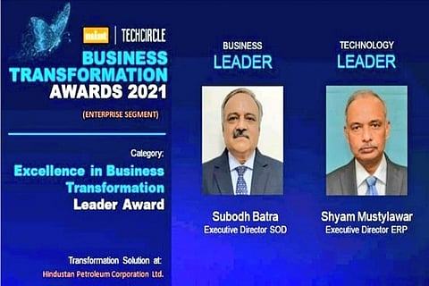 New Delhi: Hindustan Petroleum Corporation Limited (HPCL) has been awarded the prestigious Mint – Tech Circle's Excellence in Business Transformation Award 2021 for its innovative approach to digitize and automate supply chains and unique initiative of smart terminals. HPCL's Executive Director (SOD) Subodh Batra and Executive Director (ERP) Shyam Mustyalwar have been conferred with Business Leader & Technology Leader respectively by Hindustan Times Group & Mosaic Digital, after an elaborate evaluation by the esteemed Jury.