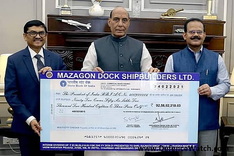 New Delhi: Mazagon Dock Shipbuilders Limited (MDL) has paid an interim dividend of Rs 92.56 crore for the current financial year (FY 2020-21) on Wednesday. Union Defence Minister Rajnath Singh has received an interim dividend cheque of Rs 92.56 crore from the Defence PSU in New Delhi. MDL's Chairman & Managing Director (CMD) Vice Admiral Narayan Prasad (Retd.) handed over the cheque to the Minister in the presence of Secretary (Defence Production) Raj Kumar (IAS).