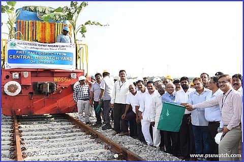 Vizag: Vizag Steel Plant – RINL's Chairman & Managing Director (CMD) PK Rath has flagged-off the first rail dispatch of various products of Vizag Steel from Central Dispatch Yard (CDY) on Saturday. The rail dispatch has a full rake of 43 wagons comprising approximately 2,500 tons of various products of VSP. The Rail dispatch was executed with the help of Railways. On the occasion RINL's Director (Personnel) KC Das, Director (Commercial) DK Mohanty, Director (Projects) KK Ghosh, Executive Director (Projects) I/c R Nagarajan, Executive Director (Works) Vidyasagar, Executive Director (Marketing) SK Chakrabarty, Executive Directors, senior officials from marketing and plant were present.