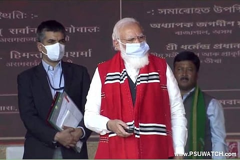 New Delhi: Prime Minister Narendra Modi dedicated to the nation INDMAX Unit at Indian Oil's Bongaigaon Refinery, Oil India Limited's Secondary Tank Farm at Madhuban, Dibrugarh and a Gas Compressor Station at Hebeda Village, Makum, Tinsukia remotely from Dhemaji in Assam Monday. He also inaugurated the Dhemaji Engineering College and laid the foundation stone for Sualkuchi Engineering College in Assam.