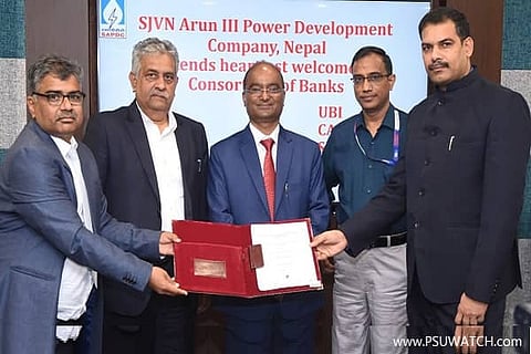 New Delhi: SJVN Arun- 3 Power Development Company, a subsidiary of SJVN Limited in Nepal, on Tuesday signed term loan documents for a drawl of Rs 6,333.40 crore loan with the consortium of banks from India and Nepal. The consortium, led by the State Bank of India (SBI) and PNB, have Exim Bank, Canara UBI and Everest Bank, Nepal & Nabil Bank, Nepal as consortium members. The term loan signing ceremony was performed in the presence of SJVN Limited's Chairman & Managing Director (CMD) Nand Lal Sharma and Director (Finance) AK Singh besides senior officers.