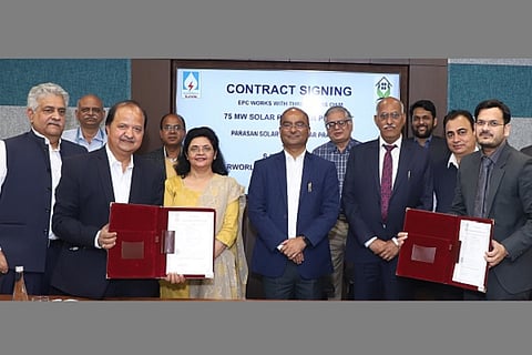 New Delhi: SJVN Limited has entered into a contract agreement for the development of a 75 MW (AC) solar power project at Parasan Solar Park, Uttar Pradesh, on an engineering, procurement and construction (EPC) basis with subsequent O&M for three years with Solarworld Energy Solutions Private Limited, Noida, the PSU said in an official statement on Friday. The contract has been signed in the presence of SJVN Limited's CMD Nand Lal Sharma, Director (Personnel) Geeta Kapur, Director (Civil) SP Bansal, Director (Finance) Akhileshwar Singh and Director (Electrical) Sushil Sharma.