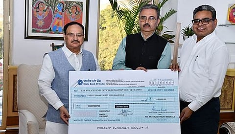 New Delhi: FCI Aravali Gypsum & Minerals India Limited (FAGMIL), a PSU under the Ministry of Chemicals & Fertilizers, on Friday announced the payment of a dividend of Rs 12.84 crore to the Government. FAGMIL's Chairman & Managing Director (CMD) Brigadier Amar Singh Rathore presented a dividend cheque of Rs 12,84,00,000 to the Minister of Chemical & Fertilizers and Health & Family Welfare, Shri Jagat Prakash Nadda.