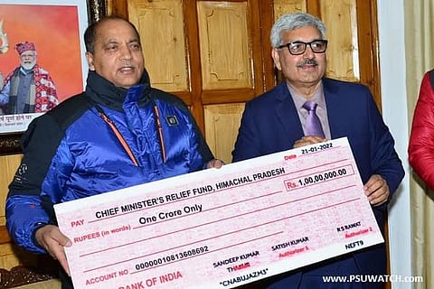 New Delhi: NHPC Limited's Chairman & Managing Director (CMD) AK Singh handed over payment intimation advice of Rs 1 crore to Chief Minister of Himachal Pradesh Jai Ram Thakur as NHPC's contribution towards Chief Minister Relief Fund (CMRF) on Januaury 23 at Shimla (HP), said the Ministry of Power in a statement on Monday. The Chief Minister Relief Fund is used when natural calamities or tragedies strike a state. It is provided to affected residents for immediate relief to minimise the grief and loss of the people. It is also utilised for humanitarian purposes in adverse circumstances.