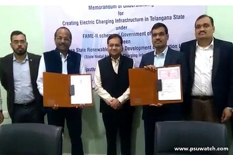 Raipur: Rajasthan Electronics & Instruments Limited (REIL) and Telangana State Renewable Energy Development Corporation Limited (TSREDCO) have signed an MoU for creating Electric Vehicle (EVs) charging infrastructure in the state of Telangana under the 'FAME Scheme' of the Ministry of Heavy Industries & Public Enterprises. The MoU has been signed in the presence of REIL's Managing Director (MD) Dr AK Jain by REIL's General Manager RK Gupta, and TSREDCO General Manager GSV Prasad. While REIL has been working with the Department of Heavy Industry to set up EV charging infrastructure across the country to promote e-mobility and has already installed 200 EVs charging stations in the first phase. TSREDCO has been appointed as 'State Nodal Agency' by the government of Telangana for implementation of EVs charging stations in the state with the objective of facilitating charging of e-vehicles.